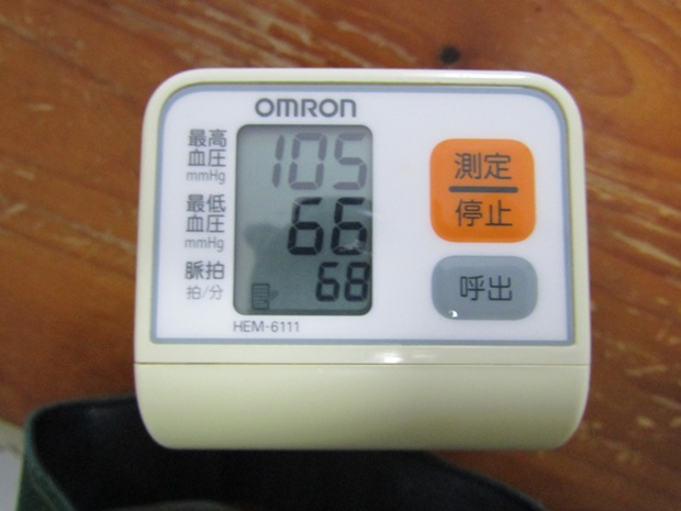 けさの血。心臓病の薬を飲んでいるので血圧が低いのは当たり前である。