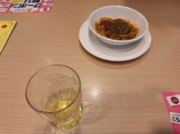 知人は、スパゲッテイを頼みました。自分は、元気がなかったせいで、リアルゴールドを何杯か飲みました。